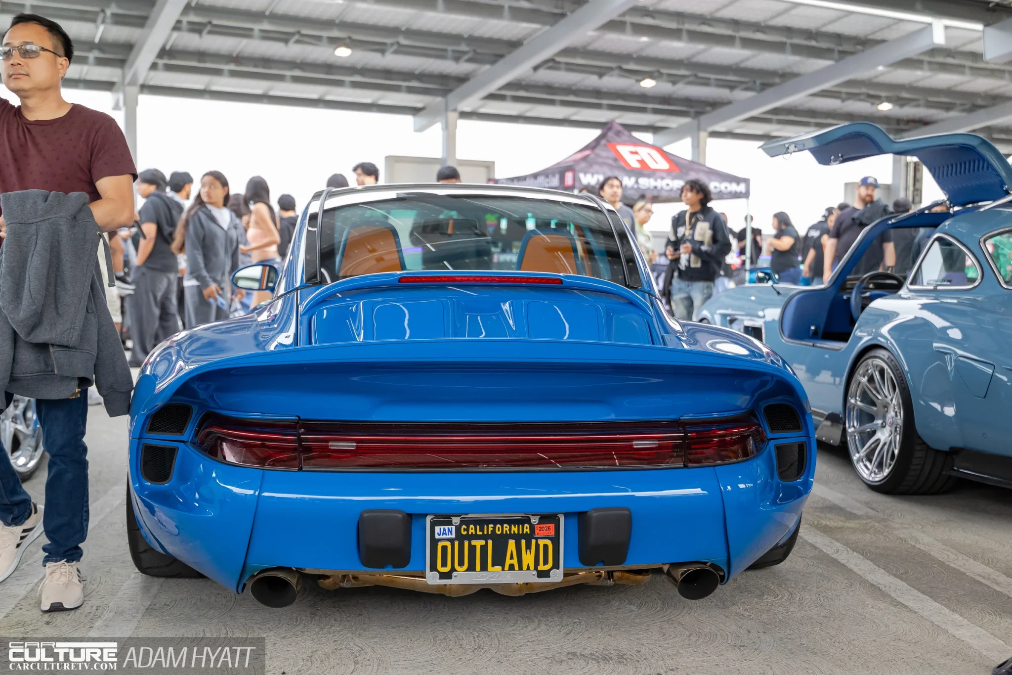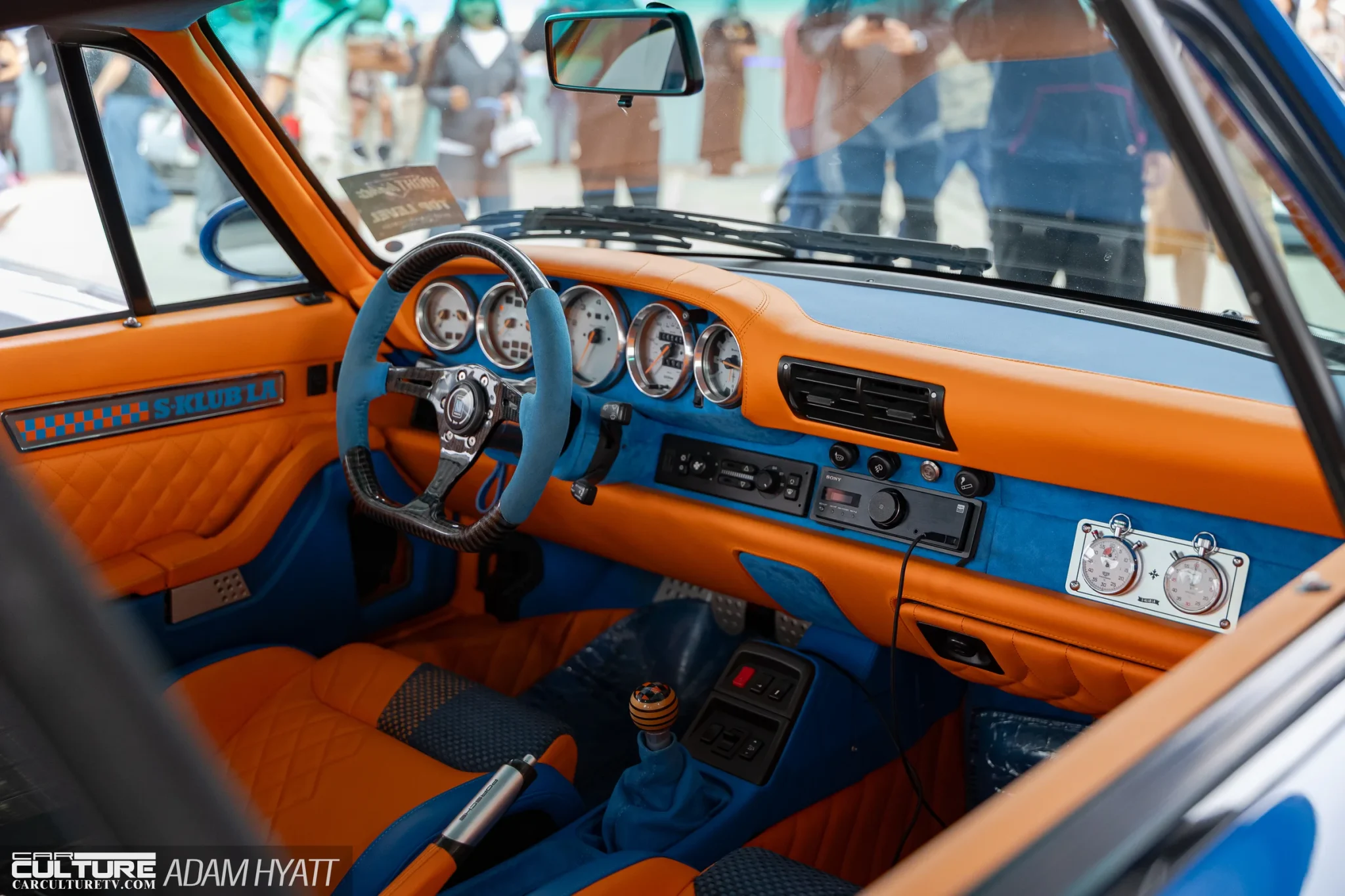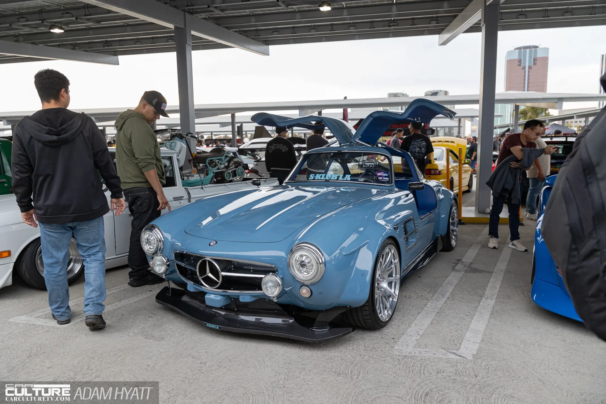 A blue Porsche 993 widebody with an orange interior pulled steady crowds. The S-Klub LA Mercedes 300SL restomod in slate blue opened its gullwing doors and didn’t close them for hours.