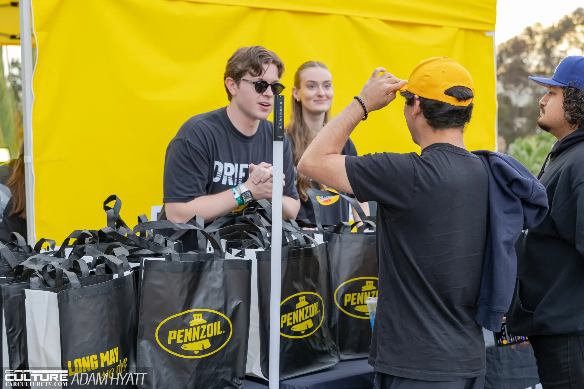 Kei Miura of TRA Kyoto, the man behind the Rocket Bunny brand, was also at the event, giving enthusiasts a chance to meet the designer whose body kits were literally parked all around them. The Pennzoil backdrop, branded with Drifter movie ties, gave the whole section a unified, high-production look that set it apart from the rest of the show floor.
